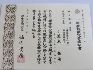 一級塗装技能士の合格証書が届きました。より一層前向きな気持ちになれました。お客様満足度向上を目指し邁進してまいります。