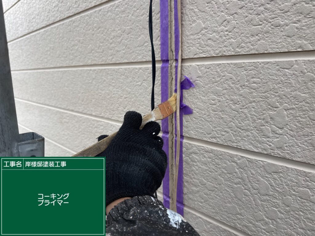 新しく充填するシーリング材と外壁材の密着性を高めるため、専用の**プライマー(接着下塗り材)**を刷毛で入念に塗布します。この工程を省くと、数年でシーリングが剥がれる原因となります。