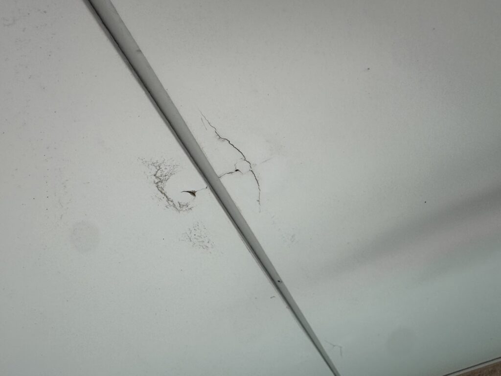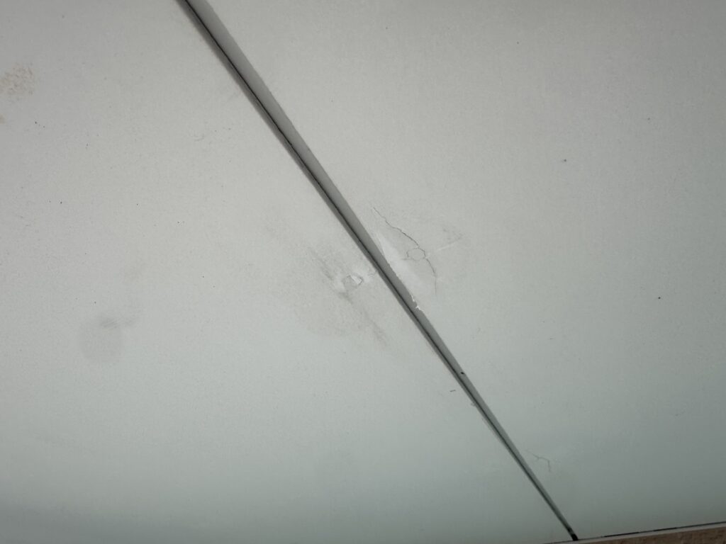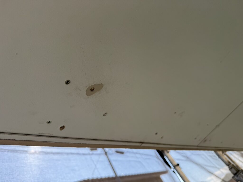 施工前は、ビス頭の錆(サビ)による塗膜の剥がれや、ボード継ぎ目のひび割れが発生していました。これらを放置して上から塗っても、すぐに剥がれや錆が再発してしまいます。