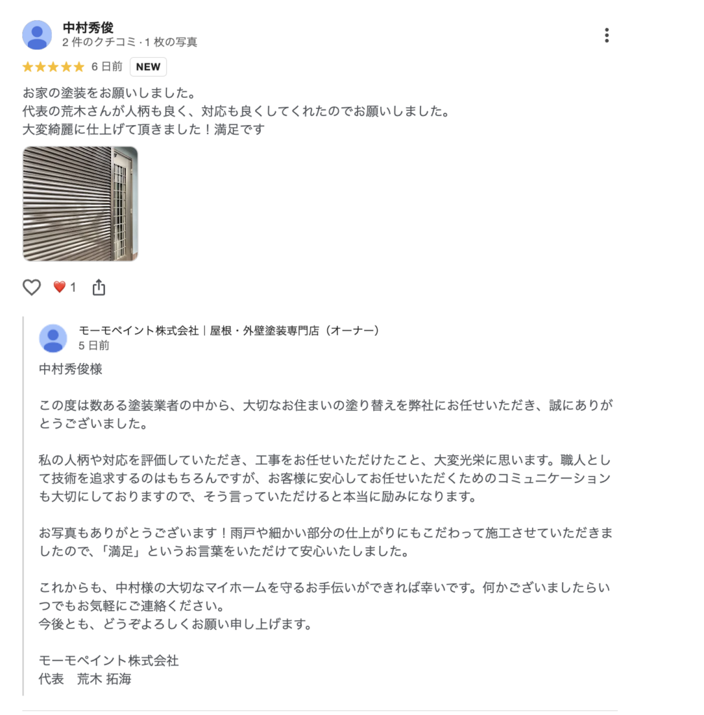 お家の塗装をお願いしました。代表の荒木さんが人柄も良く、対応も良くしてくれたのでお願いしました。大変綺麗に仕上げて頂きました!満足です 2026年4月2日 最終更新日時 : 2026年4月6日 綿貫翼 FacebookXBlueskyHatenaCopy