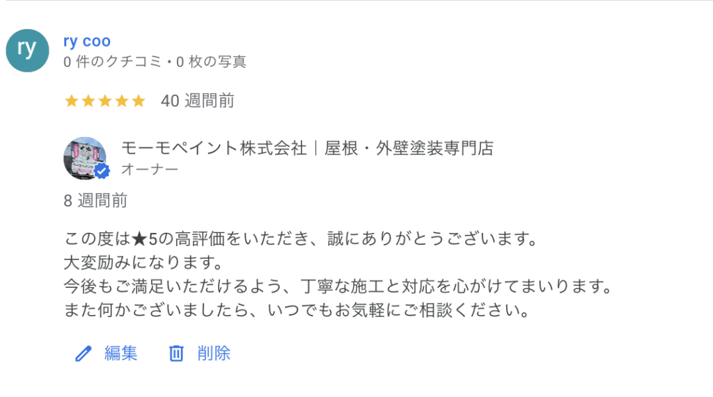 この度は★5の高評価をいただき、誠にありがとうございます。大変励みになります。今後もご満足いただけるよう、丁寧な施工と対応を心がけてまいります。また何かございましたら、いつでもお気軽にご相談ください。