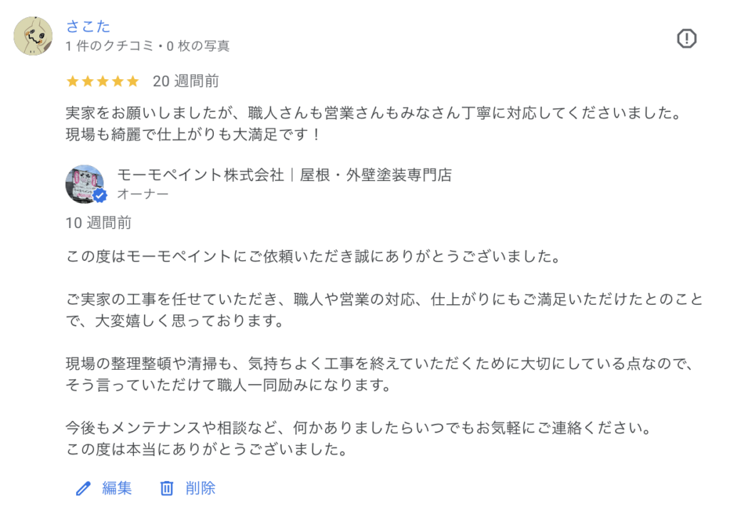 実家をお願いしましたが、職人さんも営業さんもみなさん丁寧に対応してくださいました。現場も綺麗で仕上がりも大満足です!モーモペイント株式会社|屋根・外壁塗装専門店オーナー10 週間前この度はモーモペイントにご依頼いただき誠にありがとうございました。ご実家の工事を任せていただき、職人や営業の対応、仕上がりにもご満足いただけたとのことで、大変嬉しく思っております。現場の整理整頓や清掃も、気持ちよく工事を終えていただくために大切にしている点なので、そう言っていただけて職人一同励みになります。今後もメンテナンスや相談など、何かありましたらいつでもお気軽にご連絡ください。この度は本当にありがとうございました。